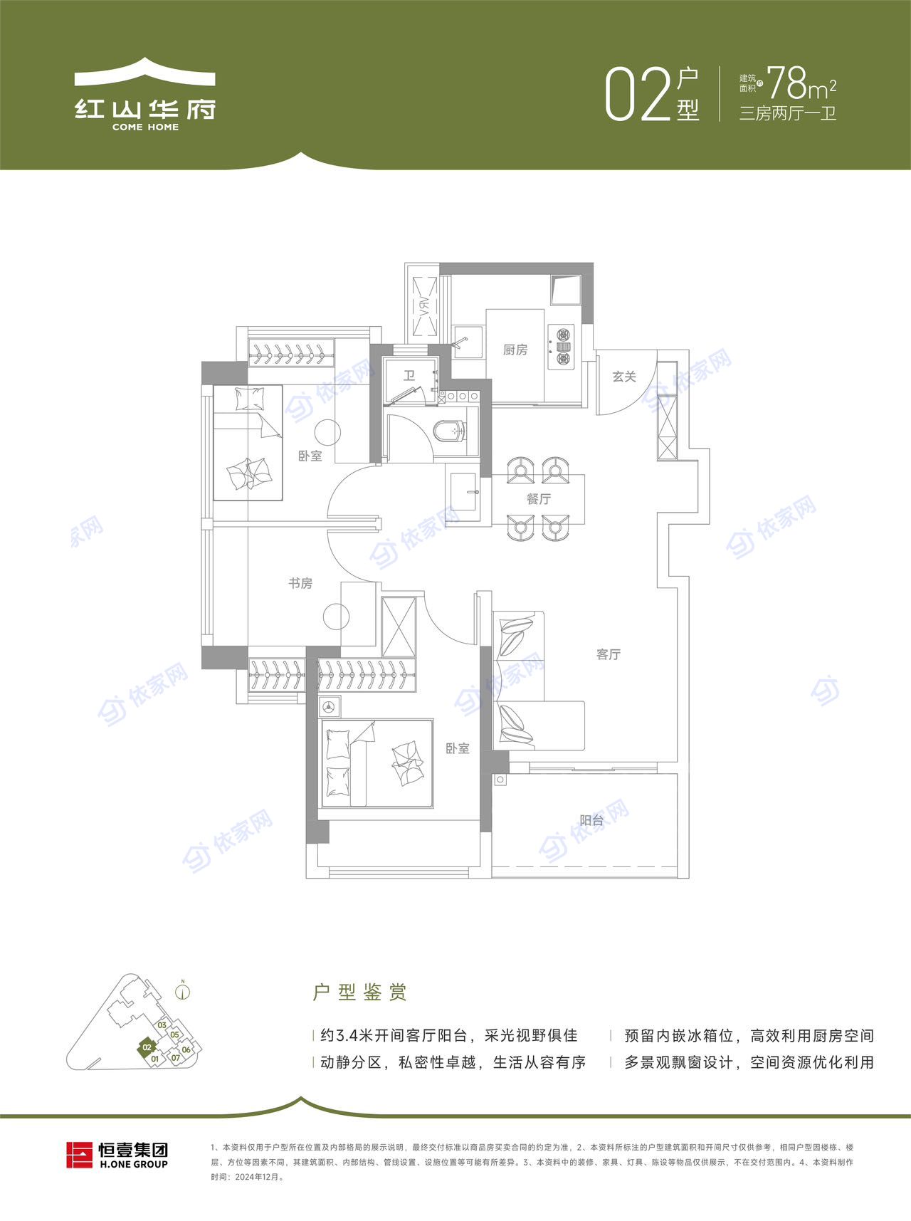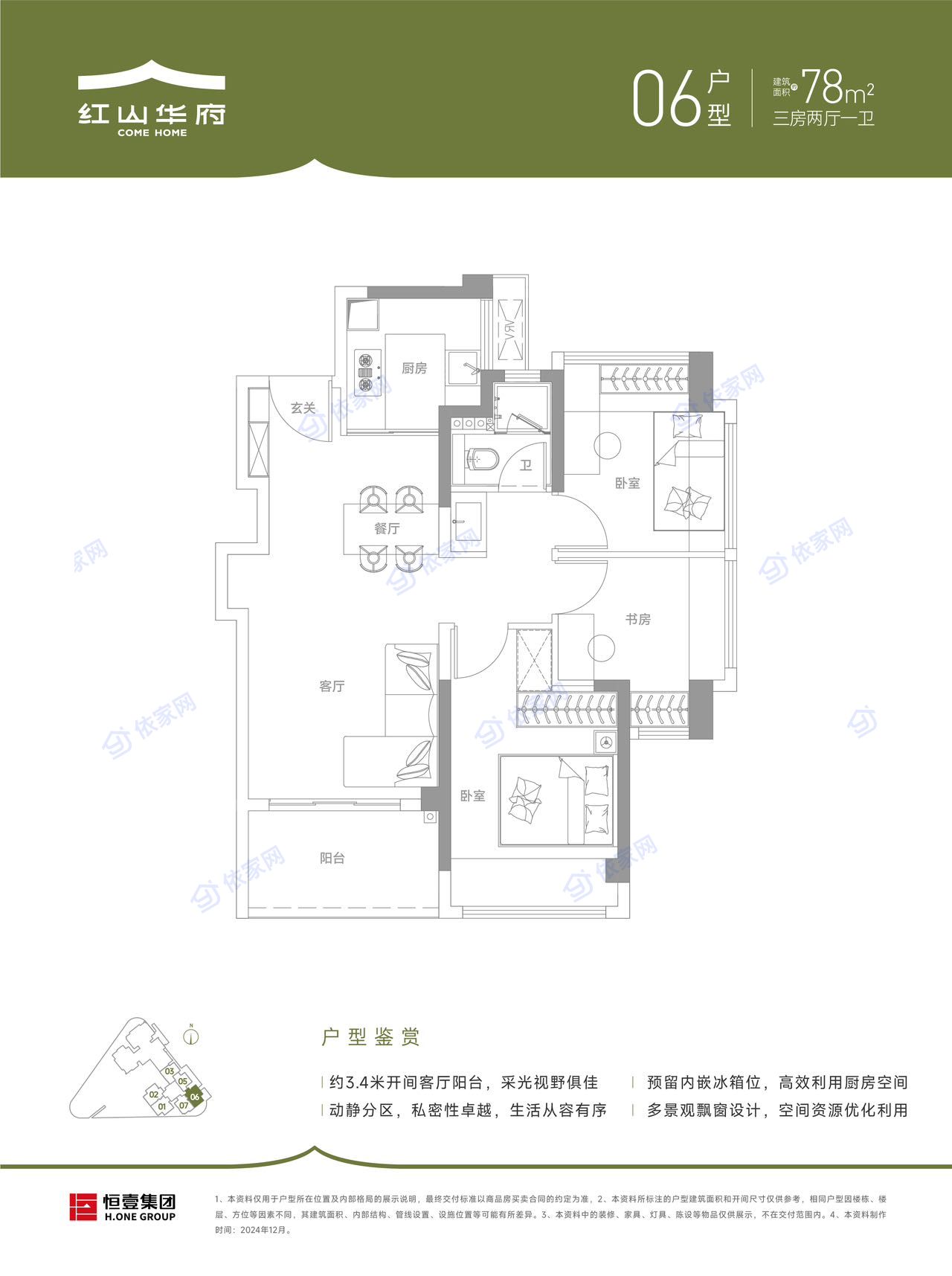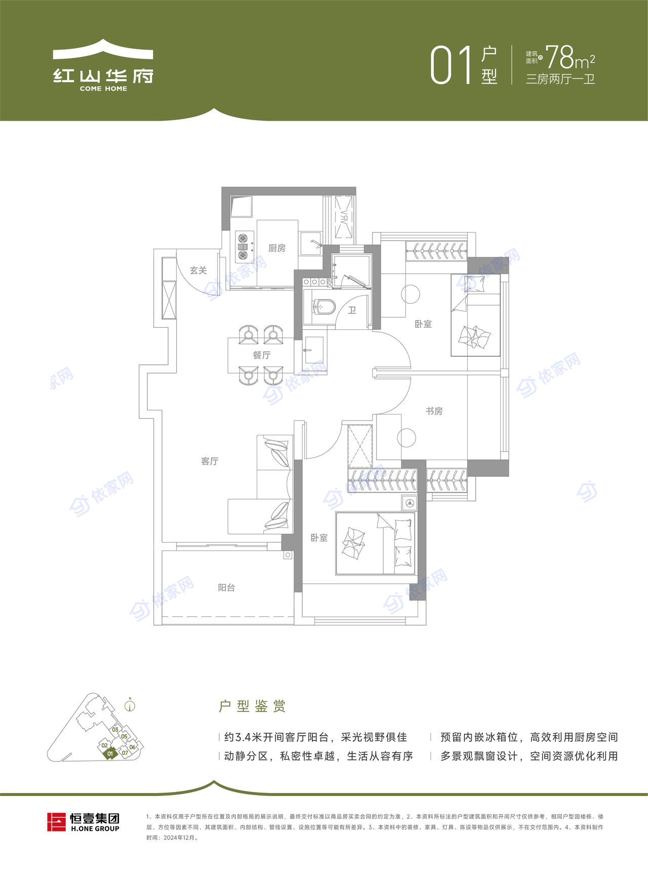 在售面积:96-99-116-118平 1栋一单元3梯5户,二单元3梯4户 2025年9月交房,使用率81%,44层 开发商:宏发 占地:4.8万平米 建面:55万平米